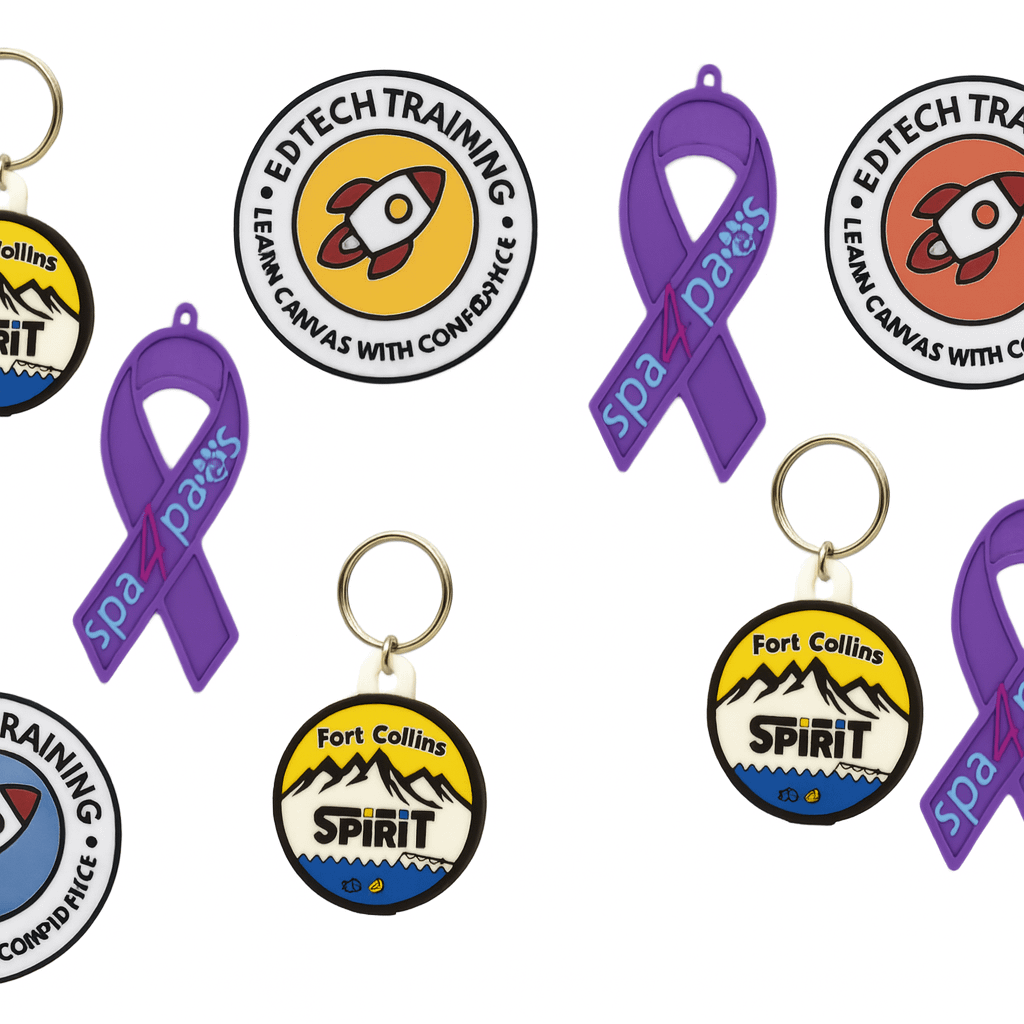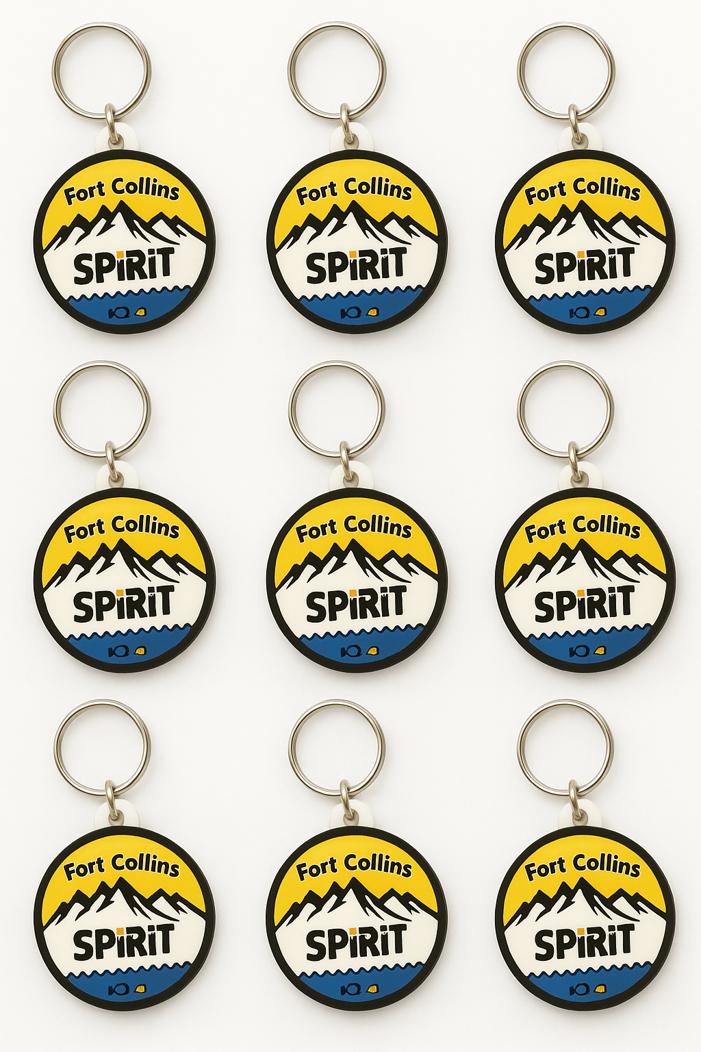 To celebrate the Fort Collins Spirit ultimate frisbee teams, we created these custom keychains for players to receive as a team gift. Each one features the bold mountain silhouette and the teamโs vibrant yellow-and-blue colors in a clean, durable, circular design perfect for bags or keys.