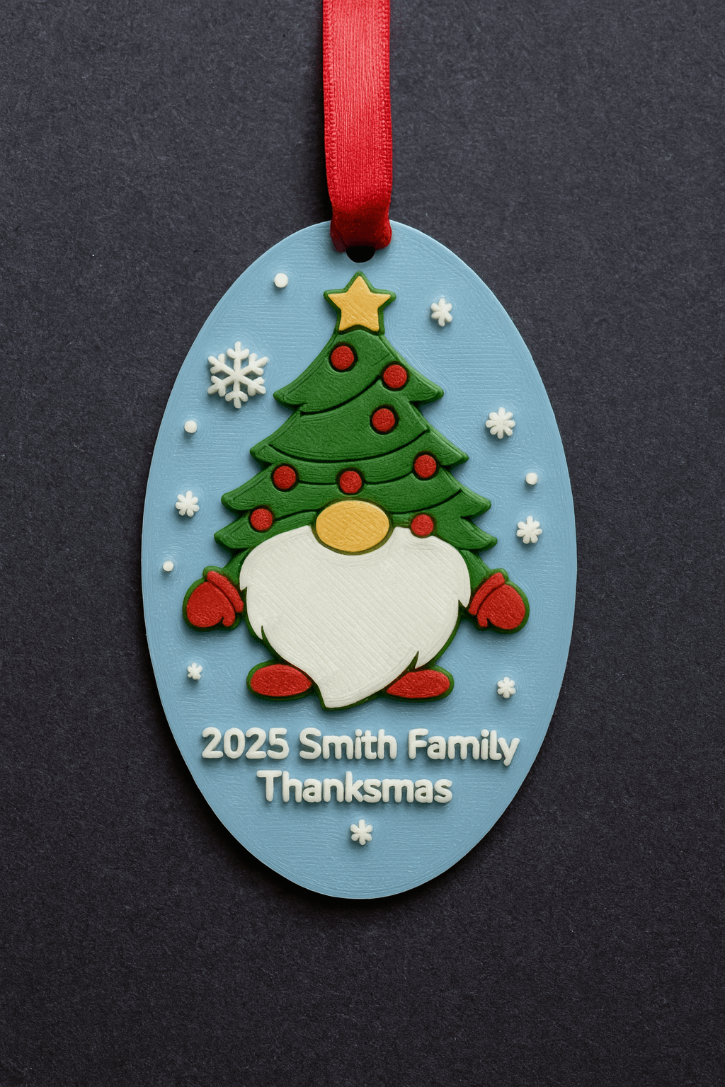 Bring your family traditions or special events to life with custom 3D-printed ornaments. This design was created for a family Thanksmas celebration and shows how we can turn any artwork, theme, or idea into a durable, multi-color keepsake.